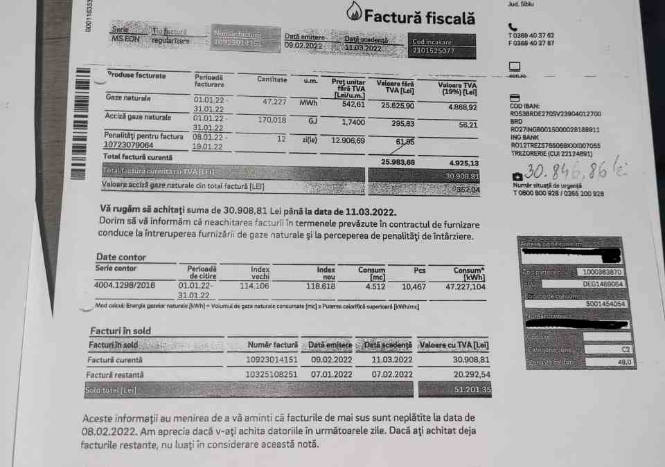 După cum se poate observa și în imaginea de mai sus, aceștia au de achitat suma de 30.908.81 lei până la data de 11.03.22, pe lângă o restanță de 20.292.54 de lei.
