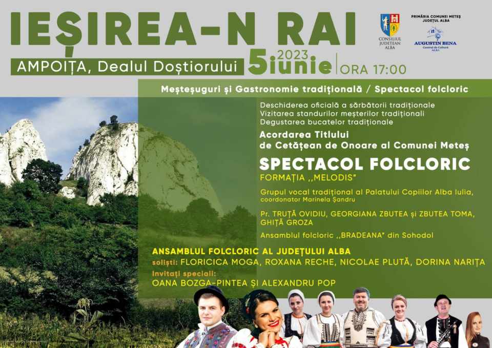 Luni, 5 iunie 2023, de la ora 17.00, sunteți învitați cu drag pe Dealul Doștiorului din Ampoița acolo unde, conform tradiției, în a doua zi de Rusalii, va fi organizată sărbătoarea populară „Ieșirea-n Rai”.